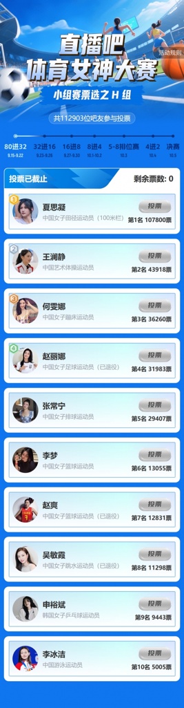 ①夏思凝(107800票)、②王澜静(43918票)、③何雯娜(36260票)、④赵丽娜(31983票)。