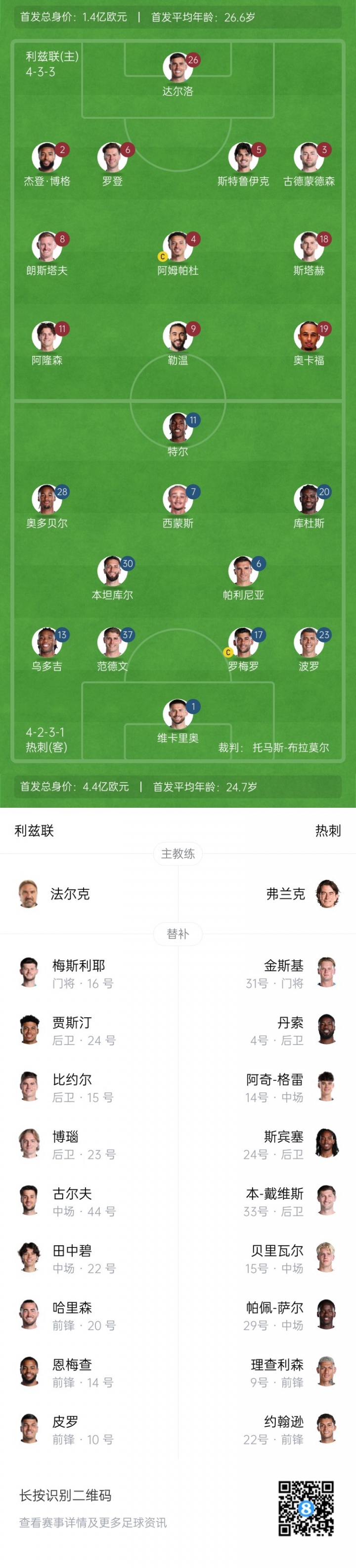 利兹联替补:1-梅斯利耶、15-比约尔、23-博瑙、24-贾斯汀、44-古尔夫、22-田中碧、10-皮罗、38-哈里森、14-恩梅查
